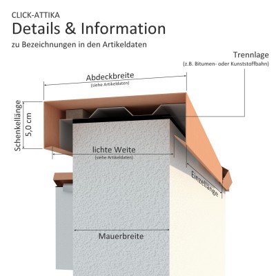 Der Überstand der Mauerabdeckung sollte auf beiden Seiten mindestens 20 mm betragen um ein Abtropfen von Oberflächenwasser ohne Verunreinigung der zu schützenden Wand zu gewährleisten. Die vertikale Schenkellänge sollte mindestens 50 mm sein und mit einen umgeschlagenen Wasserfalz (Tropfkante) enden.