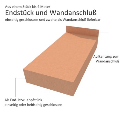 Der Überstand der Mauerabdeckung sollte auf beiden Seiten mindestens 20 mm betragen um ein Abtropfen von Oberflächenwasser ohne Verunreinigung der zu schützenden Wand zu gewährleisten. Die vertikale Schenkellänge sollte mindestens 50 mm sein und mit einen umgeschlagenen Wasserfalz (Tropfkante) enden.