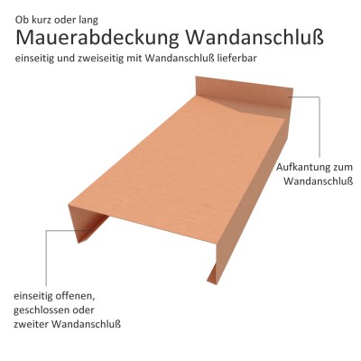 Der Überstand der Mauerabdeckung sollte auf beiden Seiten mindestens 20 mm betragen um ein Abtropfen von Oberflächenwasser ohne Verunreinigung der zu schützenden Wand zu gewährleisten. Die vertikale Schenkellänge sollte mindestens 50 mm sein und mit einen umgeschlagenen Wasserfalz (Tropfkante) enden.