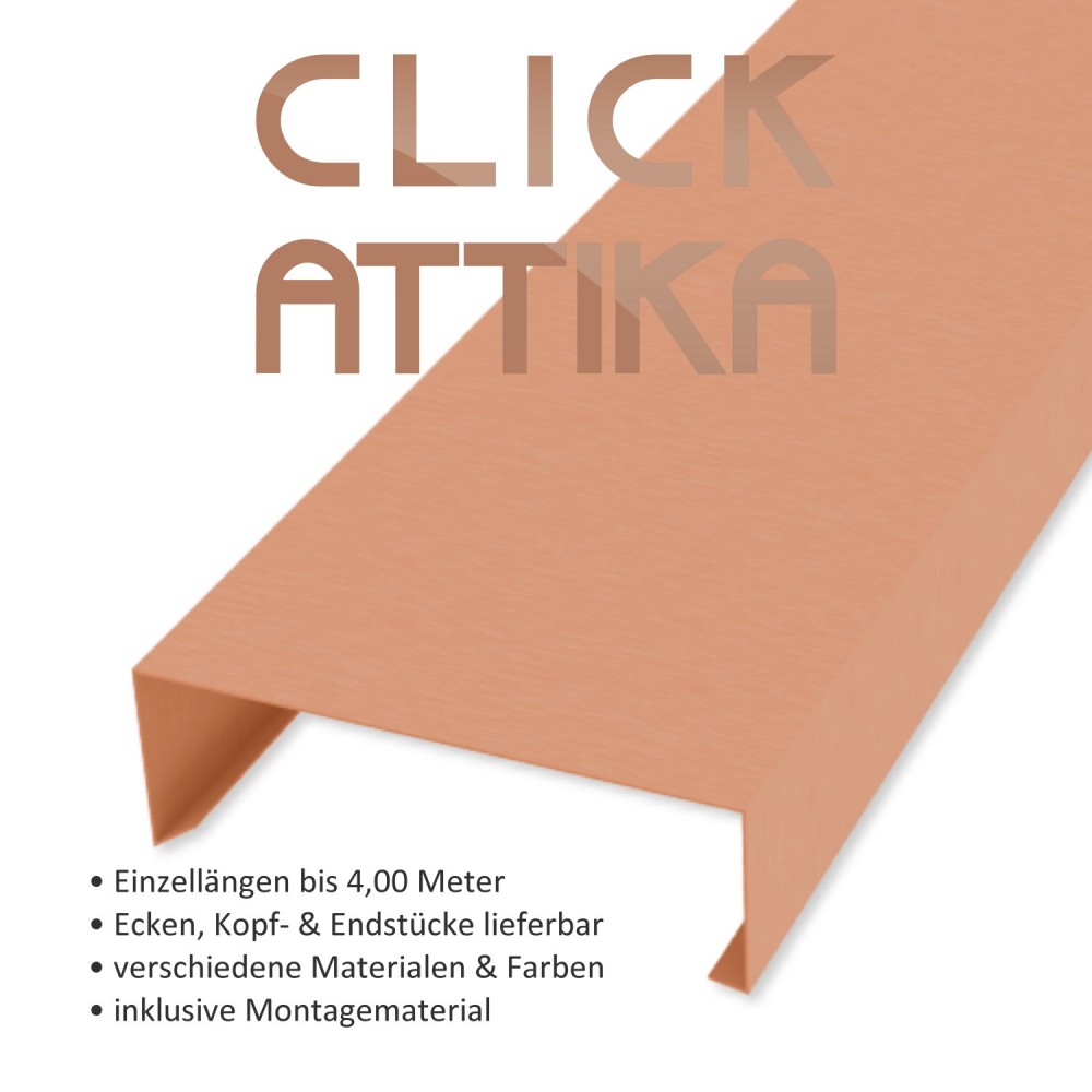 Die Click-Attika Mauerabdeckung KUNA-56200 aus Kupfer Natur (walzblank) ist geeignet zum Abdecken von Mauern bis 52cm Mauerbreite (Fertigmass) und wird inklusive 2 Stück Systemprofilhalter SPH-560E, Länge 0,5 Meter, aus Edelstahl walzblank 1,0 mm und Befestigungsschrauben geliefert. Bei Bestellung von mehreren Abdeckungen, Ecken oder Endstücken sind zusätzlich die passenden Stoss-Unterverbinder in der entsprechenden Anzahl enthalten.