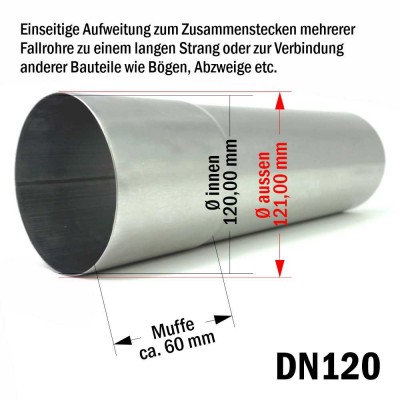 Dieses runde Fallrohr aus Titanzink hat einen Durchmesser von 120 mm und eine Länge von 0,5 Meter. Die Aufweitung / Muffe 5cm am oberen Ende dient zum einfachen Zusammenstecken mehrerer Fallrohre zu einem langen Strang.
