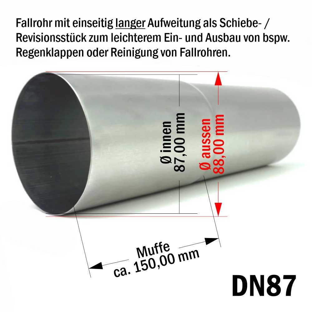 Dieses runde Fallrohr aus Titanzink hat einen Durchmesser von 87 mm und eine Länge von 0,5 Meter. Die Aufweitung / Lang-/Schiebemuffe 15cm am oberen Ende dient zum einfachen Zusammenstecken mehrerer Fallrohre zu einem langen Strang.